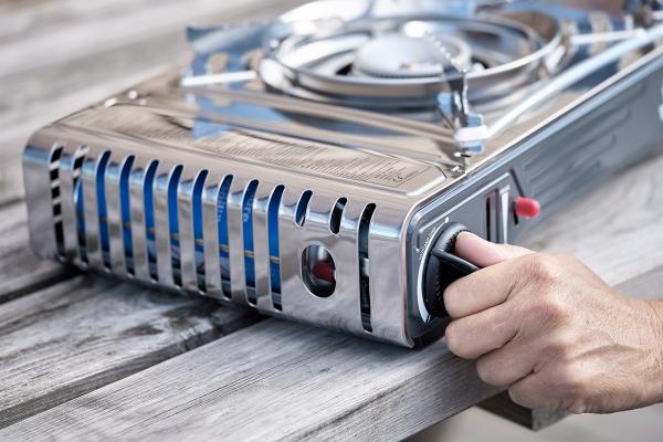 Der Gaskocher ist aus Edelstahl gefertigt und reinigungsfreundlich. Eine Grillplatte als Zubehör erhältlich.