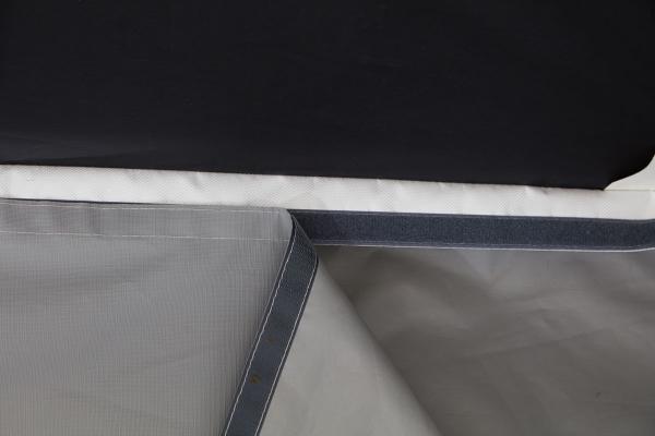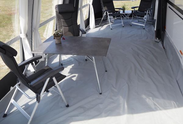 Ein robuster PVC-Boden, speziell auf das Isabella Air Cirrus North 400 zugeschnitten. Der Boden wird ganz einfach mit einem Klettverschluss seitlich am Zelt befestigt, damit kein Wasser eindringen kann.