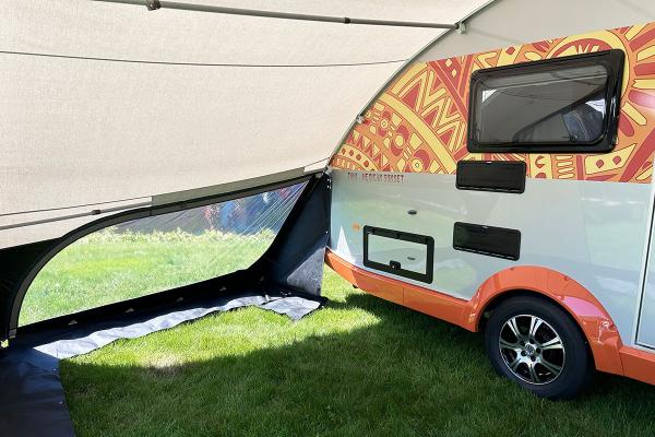 Räätälöi T@B-aurinkokatos tarpeen mukaan. Voit helposti säätää aurinkokatosta avaamalla sivuilta vetoketjun ja luoda avoimen aurinkokatoksen tai hyödyntää ison ikkunan viihtyisää kuistiratkaisua. Suuressa ikkunassa on myös integroitu aurinkovarjo, joka voidaan vetää alas, jos haluat lisää auringonvaloa.