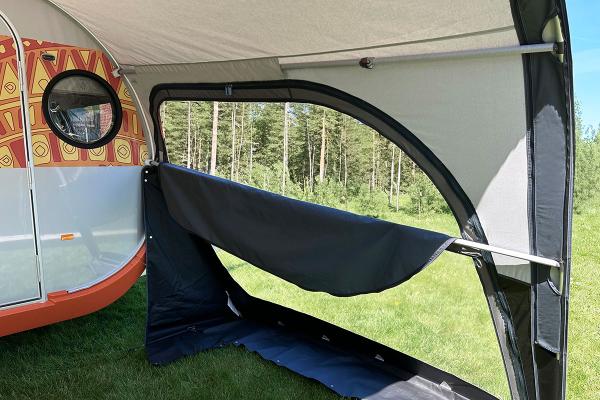 Lisävarusteet: Aurinkokatokseen voidaan ostaa etupaneeli, joka on helppo vetää kiinni vetoketjulla ja muodostaa viihtyisän kulman, joka peittää noin vasemman puoliskon etuosasta.