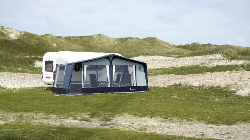 Joustava asuntovaunun ilmaetuteltta kahdessa koossa. Täydellinen valinta sinulle, joka haluat helpon ratkaisun leirintälomallesi.