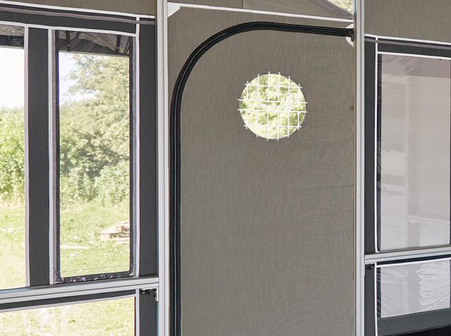VILLAn takaseinäosa voidaan säätää sopimaan kunkin matkailuvaunumallin mukaan Siten istuvuus on täsmälleen oikea ja etutelttaa voi käyttää vapaasti seisovana ilman matkailuvaunua.