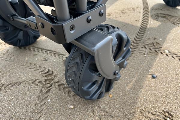Koria on tilava, ja sen mitat ovat 92 x 48 x 36 cm (n. 159 litraa). Beach Trolley painaa 11 kg ja kantaa jopa 50 kg. Pohja on irrotettava ja antaa vakautta käytössä – ja sen voi helposti poistaa, kun kärry taitetaan kasaan. Kokoon taitettuna kärry on vain 42 x 28 x 77 cm.