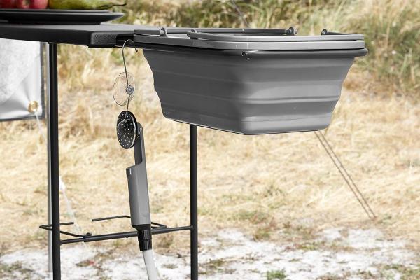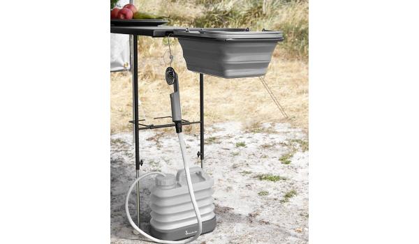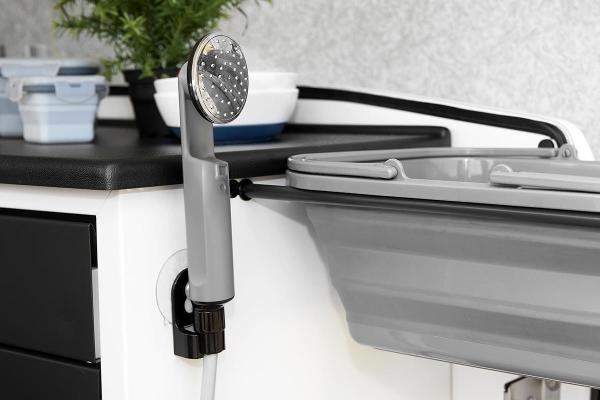 Kätevä vesihana, joka on vertaansa vailla oleva varuste leirintälomalla. Se toimii suihkusuuttimena suihkutilassa ja vesihanana keittiössä. Näin sinulla on aina suihku käden ulottuvilla ja tiskausapuväline mukana.