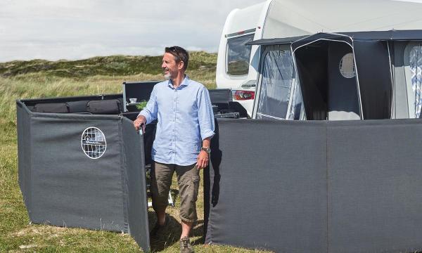 • Voidaan sijoittaa matkailuvaunua tai etutelttaa vasten tukipylvään avulla (lisävaruste)