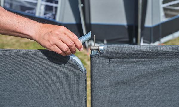 Lisävarusteet: Portti asennetaan normaalisti kahden tuulisuojan väliin, mutta jos haluat sijoittaa sen matkailuvaunuasi tai etutelttaasi vasten, sarjaa on täydennettävä tukipylväällä. Voit valita Mega-tukipylvään (900000118) tai CarbonX-tukipylvään (900000119).