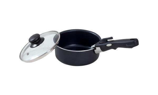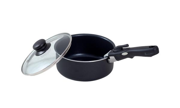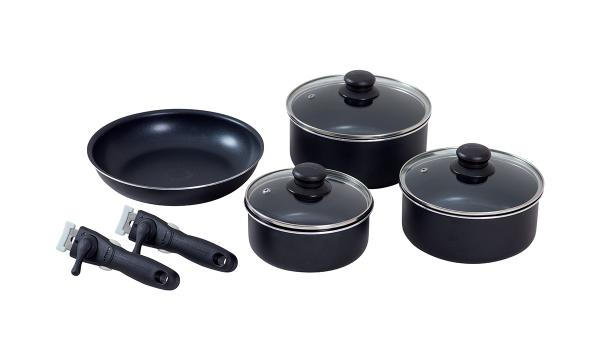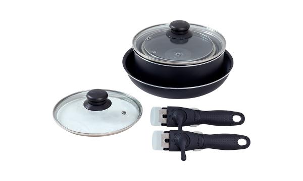 Gryt- och stekpanneset består av tre kastruller, tre glaslock, en stekpanna och två avtagbara handtag. Det är lätt att stapla och tar minimalt med plats när det inte används. Bottnarna på kastrullerna och stekpannorna fördelar värmen jämnt för bästa resultat med låg energiförbrukning. Glaslocken har ångventiler och värmebeständiga plasthandtag för säker användning. Setet kan användas på induktions-, gas- och keramikhällar.