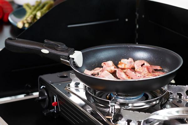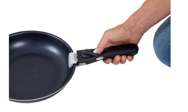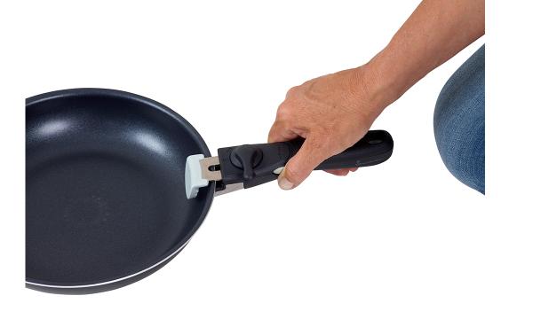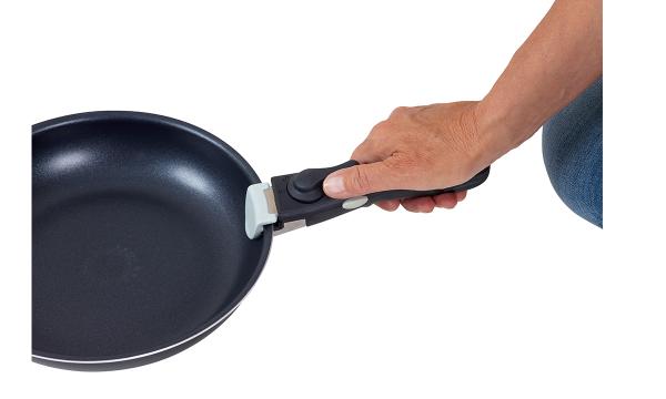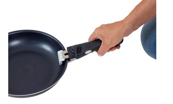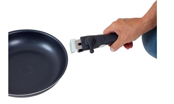Handtagen är lätta att montera genom att vrida låset åt sidan. De är försedda med ett dubbellås för att säkerställa att de inte lossnar av misstag. De passar både kastruller och stekpannor och kan enkelt bytas ut mellan dem.